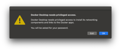 Beim ersten Start kommt es zur Aussage, dass man preveligierte Rechte benötigt, das Liegt daran, dass Docker eigene Netzwerke anlegen möchte. Einfach bestätigen mit OK und dann eueren Admin Account benutzen.