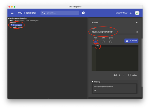Nach dem die Verbindung hergestellt wurde, sieht man $SYS bereits. Bei Publish kann man nun eine neue Message publizieren.