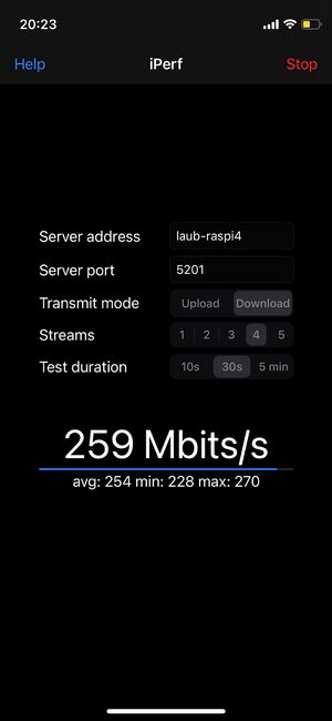 Aber Achtung, hier wird kein iPerf3 Server gestartet und ist somit nicht kompatibel zu iPerf3. Ihr müsst also zum testen zum Beispiel unter Debian das iperf Paket anstelle von iperf3 installieren und nutzen: