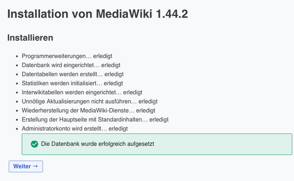 Hinweis: Das Setup ist so gebaut, dass es beim ersten Start die LocalSettings.php automatisch erzeugt/ergänzt (Short-URLs, Cache, CirrusSearch-Basis etc.) wenn man noch eine .env.mwsetup mit den MediaWiki Setup Parametern anlegt. Ansonsten kommt der MediaWiki Webinstaller beim Aufruf der MediaWiki URL.