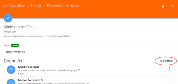 Nun richten wir ein Item ein, welches bei eingabe eines Strings Text to Speach auf dem Echo Device macht. Dafür gehen wir in unser Thing in PaperUI Configuration --> Things --> Echo Device --> Edit und dort dann auf Show More: