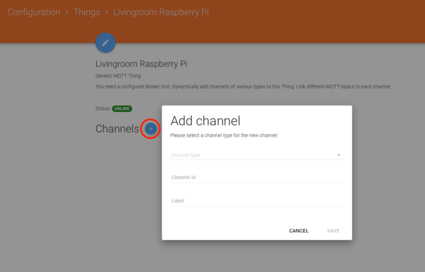 Nun editieren wir unser eben angelegtes MQTT Thing und klicken bei den Channels auf das blau hinterlegte "+"