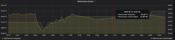 Ich dachte mir, da mein Raspberry Pi mit openHAB als Smart Home Schaltzentrale im Wohnzimmer steht, dann kann ich diesen auch mit einem Temperatur (inkl. Luftfeuchtigkeitssensor) ausstatten und die zwei ausgelesenen Werte in openHAB verwenden. Via HABPanel kann man diese dann auch anzeigen und Per Grafana in die normale Temperatur Anzeige mit aufnehmen oder eine eigene Grafik erstellen. Als Sensor habe ich mich für den oft verwendeten DHT22 entschieden. Wie man diesen Anschließt und ausliest habe ich hier bereits beschrieben: