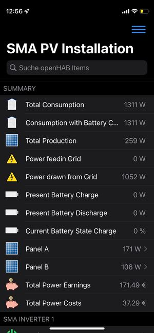 Hier findet ihr eine Beispiel Konfiguration für openHAB um via ModBus die Daten der SMA Wechselrichter eurer PV Anlage auszulesen. Ich kann so alle gewünschten Werte auslesen. Mittels einer Regeldatei ist noch der Gesamtstromverbrauch berechnet. Ebenfalls berechnet dieser die Einnahmen durch Einspeisung und auch die Ausgaben für den Zukauf vom Stromanbieter.