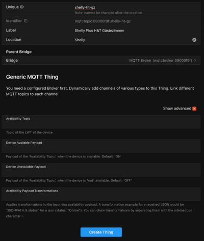 Unter Show advanced, kann man noch einrichten, wann das Thing den online status bekommt und wann es offline geht. Dies ist bei den Batterie betriebenen Geräten nicht zu empfehlen, da diese immer nur kurz online gehen, deshalb lasse ich es hier leer. Ich gehe weiter unten beim anbinden des Shelly 1PM mini darauf ein, da es dort Sinn macht.