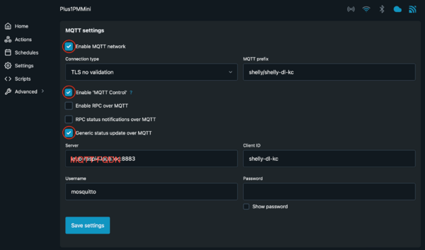 Dann das Setup speichern. Aktiviert wird es dann nach einem Device Reboot. Wenn ihr dann wieder auf die Einstellungsseite wechselt, sollte bei MQTT wie im Screenshot ein grün hinterlegtes Connected zu sehen sein.