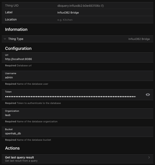 Als erstes müssen wir eine DBQuery Bridge für unsere InfluxDB Verbindung anlegen. Dafür generiert ihr am besten einen neuen READ ONLY Token im Webinterface der InfluxDB. Das Ergebnis sollte dann so aussehen.