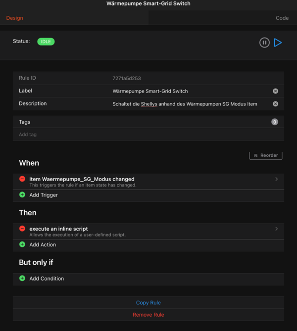 Jetzt, nachdem wir 2 Shelly Switch Items und ein Item String Item zum einstellen des gewünschten Smart-Grid Modus haben, wollen wir die drei Items miteinander über eine openHAB Regel verheiraten.