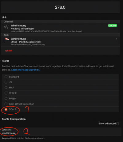 Hier wählen wir dann bei Profile SCALE aus und wählen dann weiter unten unsere windDir.scale Datei aus und speichern rechts oben mit SAVE.