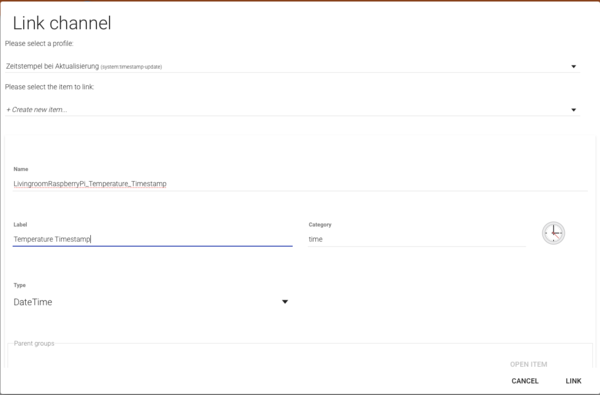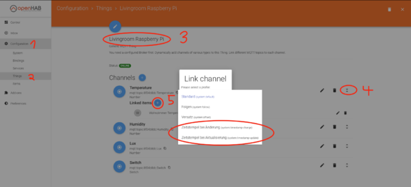 In Paper UI gehen wir zu unseren Things und wählen ein Thing aus, für dessen Channel wir ein Timestamp Item anlegen wollen. Ich nehme hier mein MQTT Thing. bei Link Channel wählen wir eines der Zeitstempel Profile aus. Ich habe mich hier für das Profile: "Zeitstempel bei Aktualisierung" entschieden.