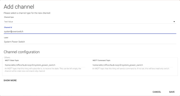 Dann fügen wir für den Topic (system_power_switch) einen eigenen Channel dem Thing hinzu: