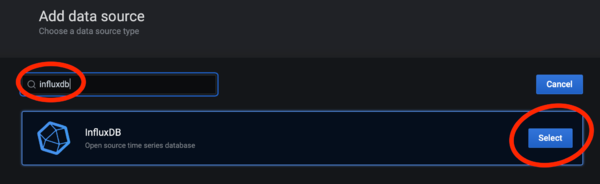 hier suchen wir nun nach influxdb und wählen dies aus: