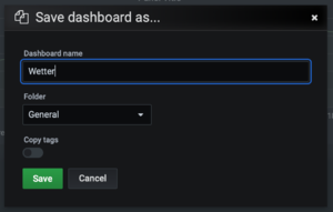 Vergeben einen Namen für das Panel und speichern das Panels samt Dashboard ab.