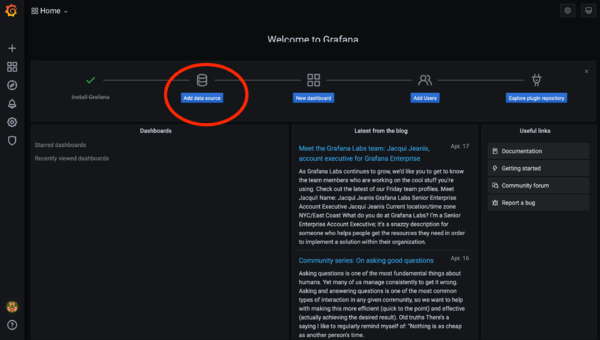 Der Standard Benutzer ist admin und das Passwort ebenfalls, also admin, admin. Man wird direkt nach dem Einloggen aufgefordert dieses zu ändern. Nun begrüßt uns die Wilkommensseite und fordert uns direkt auf, eine Data Source hinzuzufügen was wir auch gleich machen: